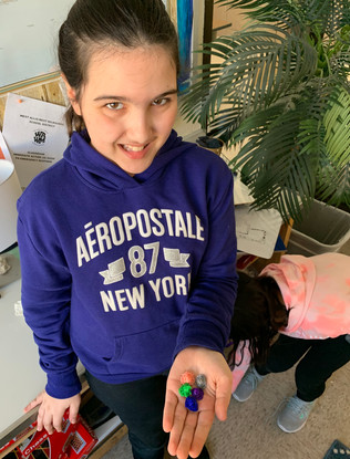Gianna completed her game board, wrote all of her questions and answer key, had her cards laminated and cut, and moved on to game pieces today. Mr. Thompson recently ordered a set of 3-D printing pens for students at Irving to use. We decided this would be perfect for game pieces. You load the desired color of filament then build up layers. Gianna got the hang of it quickly and created 5 pieces that players will move along the board to play.