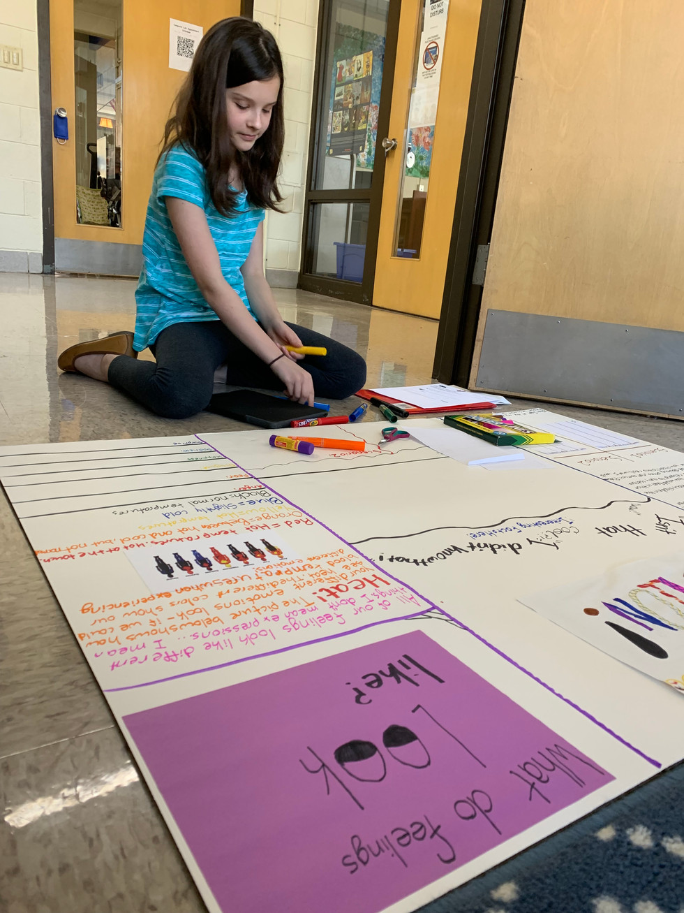 Audrey is working diligently on her display. Today she added an image that shows how the human body reacts to emotion in terms of temperature. She is elaborating on why parts of the body are cool and hot in certain situations.
