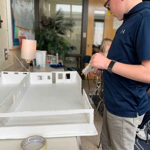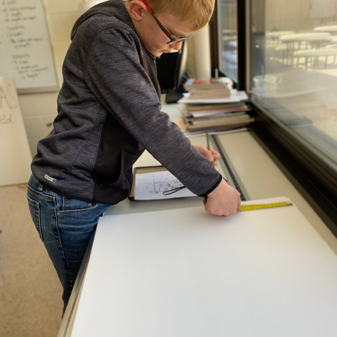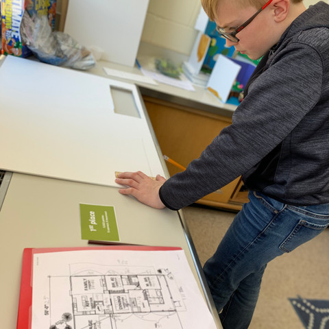 Daniel has been calculating his scale model dimensions for the last several weeks. After selecting a blue print for a home design, he used a 1/24 scale factor to determine the dimensions for his model. This week he began constructing his home model. It is great to see his determination and math skills come together!