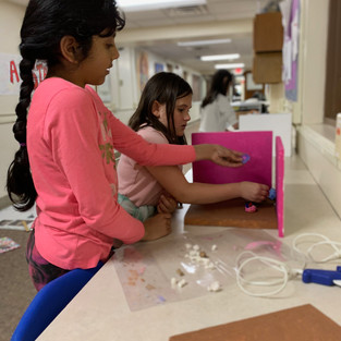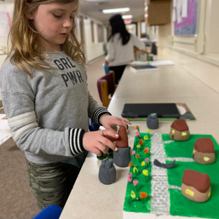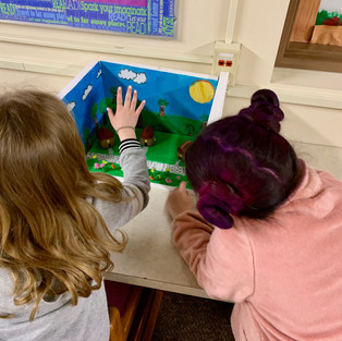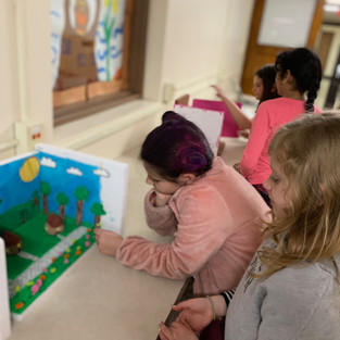 3rd Graders creating their Fairy Tale set designs are putting finishing touches on both their set models as well as their presentation displays. These groups have worked painstakingly on details and layout to make sure their ideas come across as their groups have planned. Materials that typically do not come into play while analyzing setting have really helped these imaginations thrive. In working collaboratively there are sometimes difficult discussions and decisions to be made. These groups have truly grown to manage those decisions so voices are heard and final choices are made as group. This is very impressive to observe and to take a step back on, as these designers have seen this project through.