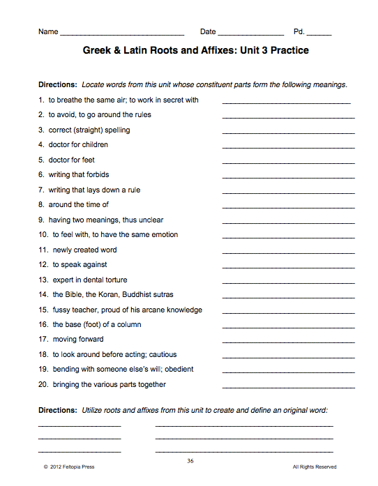 Next students worked to identify the words created by combining these roots and affixes that fit the given definitions. Initially this was challenging as we typically find definitions for words, not words for definitions. Quickly though, students recognized key words in the definitions and found the fitting words using their root/affix work.