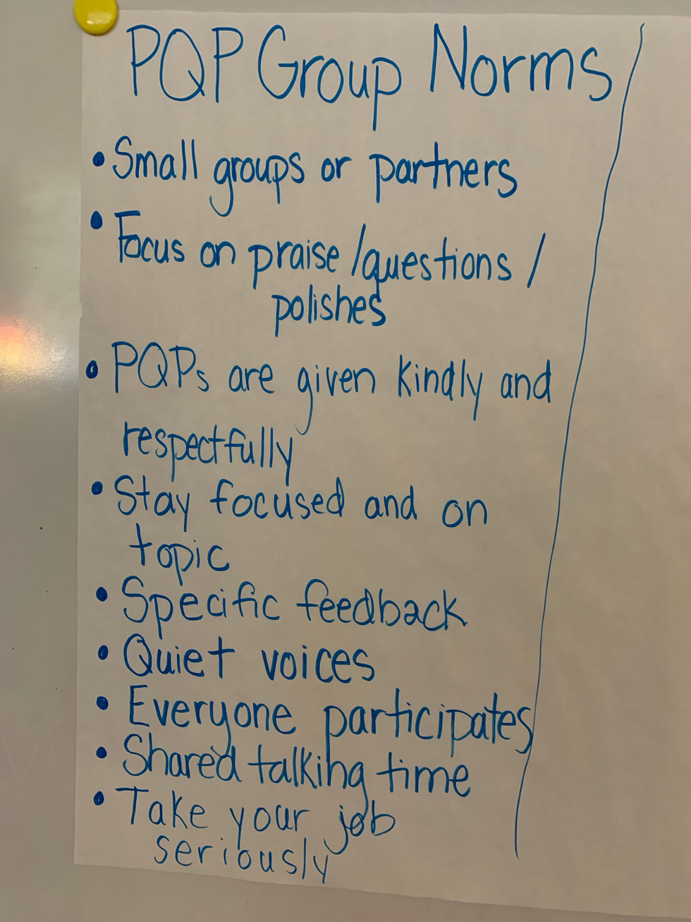 On Tuesday morning writers with Ms. Schaefer and I held a class meeting to establish our group norms for the PQP protocol/process. We discussed what norms are-how a group can establish what a particular process looks like, sounds like, and what individuals need for that routine to be successful.
